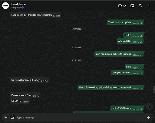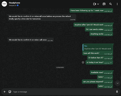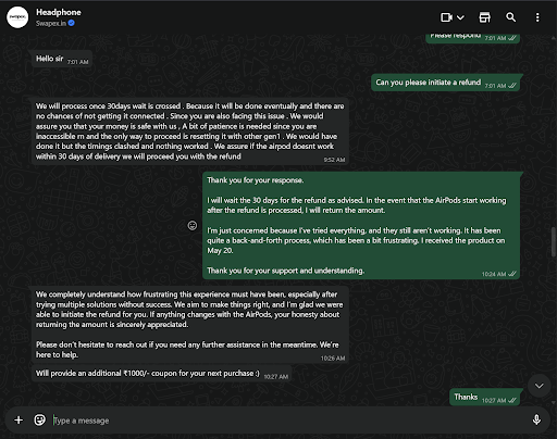 Dear Jabin,We want to begin by offering our sincerest and heartfelt apologies for the frustrating experience you’ve had. Your case has brought to light several areas where we fell short — not only in resolving the technical issue but also in how we communicated and supported you throughout the process. We’re truly sorry.We understand that you purchased a replacement left-side AirPods Pro and began facing connectivity issues from the very first use. What makes your situation even more difficult — and something we genuinely regret not handling better — is that you were traveling when the problem began. You informed our team within the return window and made it very clear that, due to your travel schedule, you needed the return process to be initiated promptly.Instead of honoring that with urgency and clarity, our team advised you to hold on to the product a bit longer, under the assumption that the connectivity issue might resolve itself — which, in some cases, does happen when a new AirPod is given time to pair fully with the existing unit. Unfortunately, this was not the case for you, and we now realize that waiting only delayed the resolution you deserved.What should have followed was a quick escalation and a clear path toward a refund or replacement. Instead, our response was delayed, inconsistent, and in the end, completely unresponsive — something we are genuinely ashamed of. The missed video verification call, the unanswered follow-ups, and the silence afterward understandably felt like you were being ignored, and we take full responsibility for that.The truth is, during this period, we experienced a significant and unforeseen staff shortage, which affected our ability to respond promptly. This is not an excuse — it’s a failure on our part to manage customer support expectations and communicate proactively, and for that, we are deeply sorry.We also acknowledge that the suggestion to keep the product and “wait and see” was not appropriate in your situation, especially given your very valid concern about being outside your return window due to travel. We should have prioritized your request, especially since the issue was reported right away and you provided all necessary documentation.Please rest assured that this case is now being handled as an exceptional priority. As soon as the AirPod is returned and received at our warehouse, a full refund will be issued as initially promised. We are monitoring this closely and will keep you informed every step of the way.Lastly, since we offer a lifetime warranty on pairing issues, it’s important to mention that the problem may have also been related to the other AirPod (most often the right one, in cases involving single-ear replacements). While we can’t confirm that without a full diagnostic, we regret that we didn’t guide you through that troubleshooting process properly. That’s something we are committed to improving moving forward.You placed your trust in us, and we let you down. We are very sorry for the time, energy, and peace of mind this has cost you. While a refund is the least we can do, please know we’re also taking internal steps to ensure no customer ever feels this way again.If there’s anything more we can do for you at this stage, please don’t hesitate to let us know. You deserve better — and we are committed to making things right.With our deepest apologies,MonikaCustomer Experience TeamSWAPEX I was so glad when I could repaired the new airpods which I ordered from Swapex. It was real and I have no issues. I am very thankful to the service provided by them.