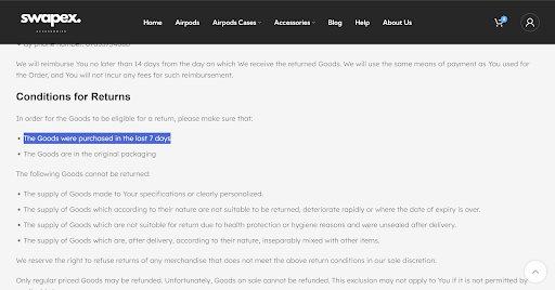 I recently purchased a new left-side AirPods Pro. However, upon receiving the product, I experienced immediate issues with connectivity and functionality. I contacted your support team right away and explained that, as I was traveling, I would like to initiate a return in line with your 7-day return policy (screenshot attached).